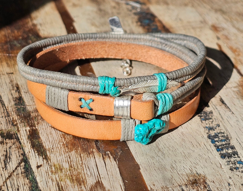 - אבן טורקיז טבעית ארוגה על העור וסוגרי כסף 925